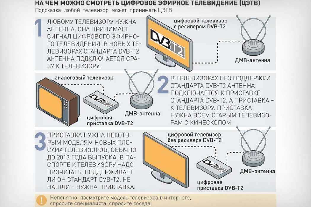 Для получения возможности телевещания в цифровом формате на старом или новом телевизоре потребуется приобрести определённое оборудование: