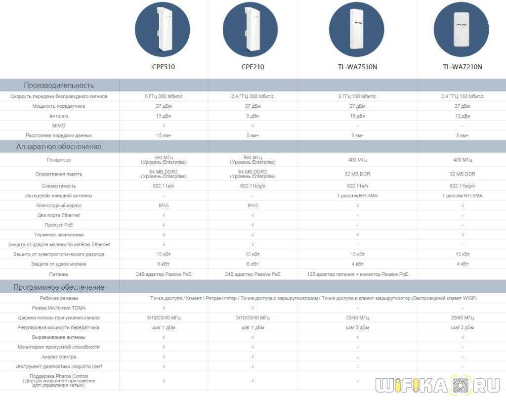 В итоге, по заявленным техническим характеристикам мы имеем всепогодные высокопроизводительные устройства, прекрасно подходящие для организации беспроводных сетей на большие расстояния. Привожу также официальную сравнительную таблицу между Pharos CPE210 / CPE510 и моделями предыдущего поколения