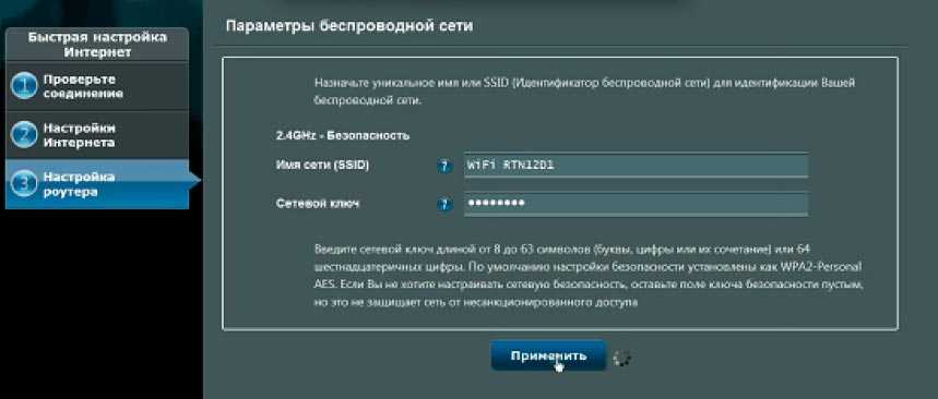 На этом шаге роутер просит ввести имя беспроводной сети — SSID и в поле «Сетевой ключ» — пароль на WiFi. В качестве имени сети можно использовать любое слово на латинице. В качестве ключа сети можно использовать любой набор символов, длиной не менее 8. Нажимаем кнопку Применить.
