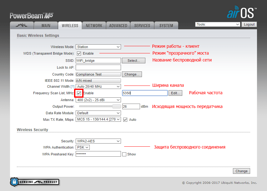 - Frequency, MHz – Рабочая частота. Выбираем внимательно, так как при выборе частоты, которая занята другим устройством, находящимся в поле радио видимости – будем наблюдать ухудшение качества сигнала.