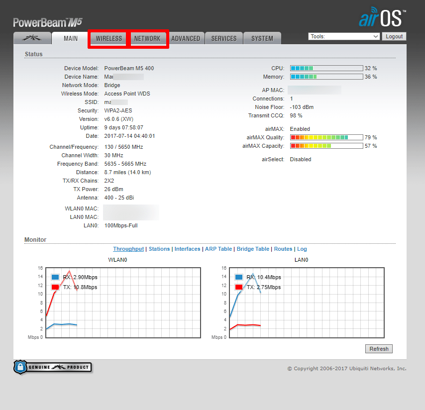 После сброса, если страница авторизации загрузилась, вводим логин/пароль ubnt/ubnt и попадаем на вкладку MAIN веб-интерфейса устройства.