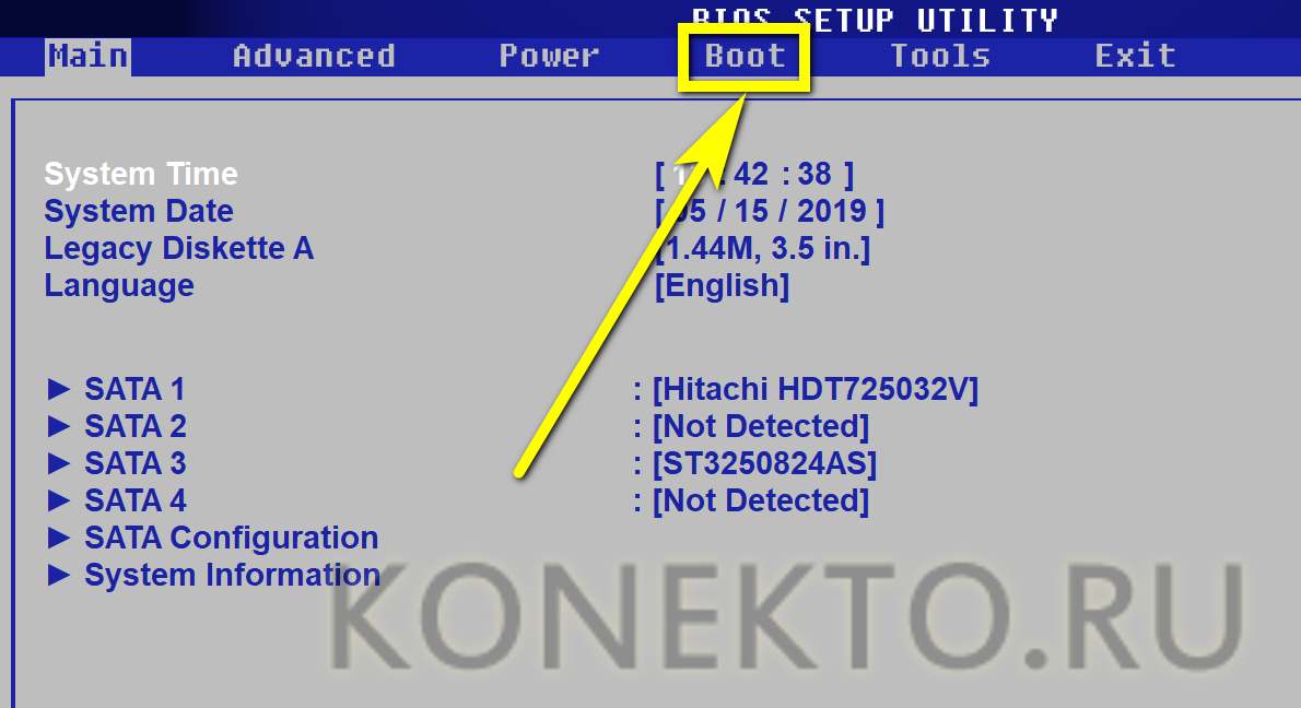 Выйти из всех программ, перезапустить ПК и открыть BIOS, применяя подходящую для данной машины комбинацию клавиш. Перейти в раздел Boot.