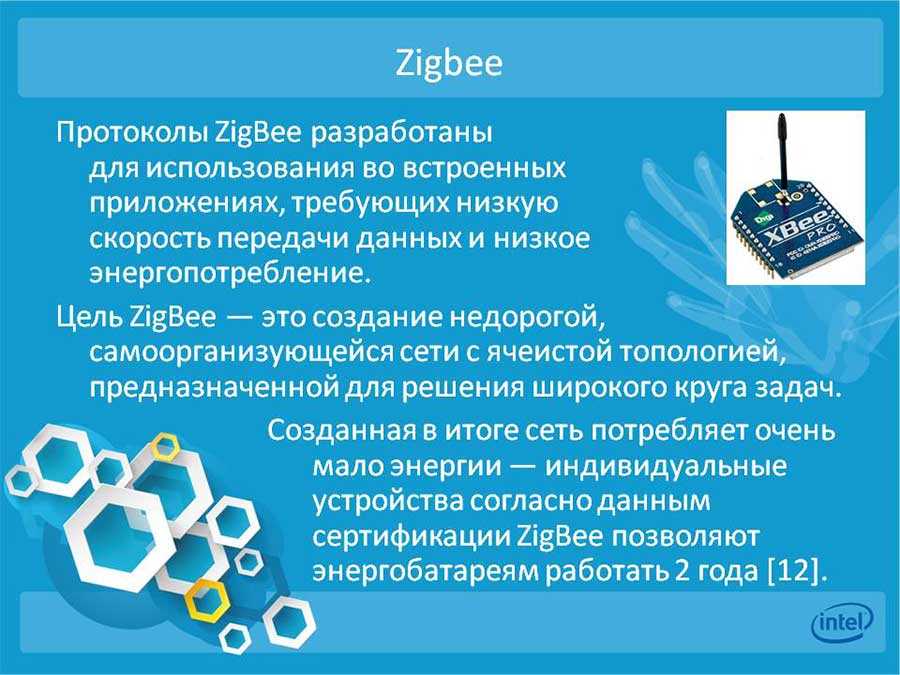 Интерфейс ZigBee имеет много общего с беспроводной сетью и «синим зубом», но у него имеется особенность — он расходует минимум электроэнергии, что обеспечивает срок службы батарейки до года и более.