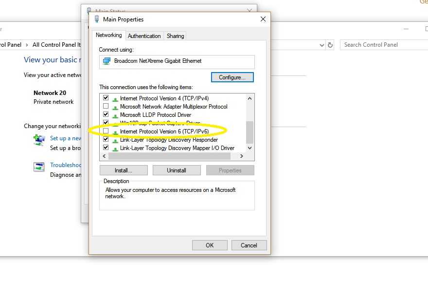 Отключение протокола версии 6 осуществляется через свойства адаптера вай-фай. Делается это по маршруту: «Центр управления сетями», «Изменение параметров адаптера», правой кнопкой мыши «Свойства», далее убрать галочку с пункта IPv6, нажать «Ок».