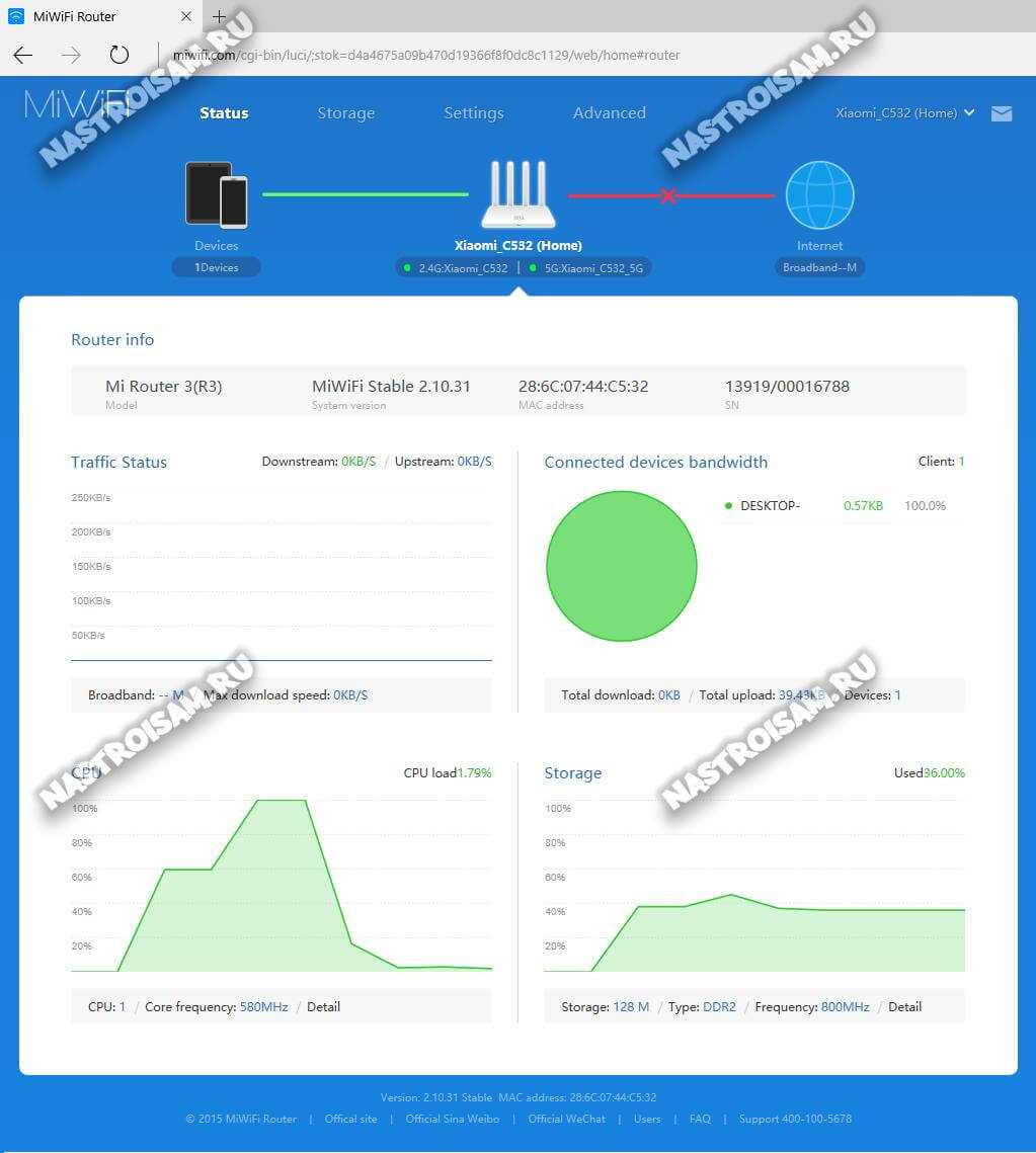 Обратите внимание, как классно сделана админ-панель. На основной страничке отображается сводная текущая информация о сети — какие устройства подключены, сколько трафика они используют, какова загрузка памяти и центрального процессора