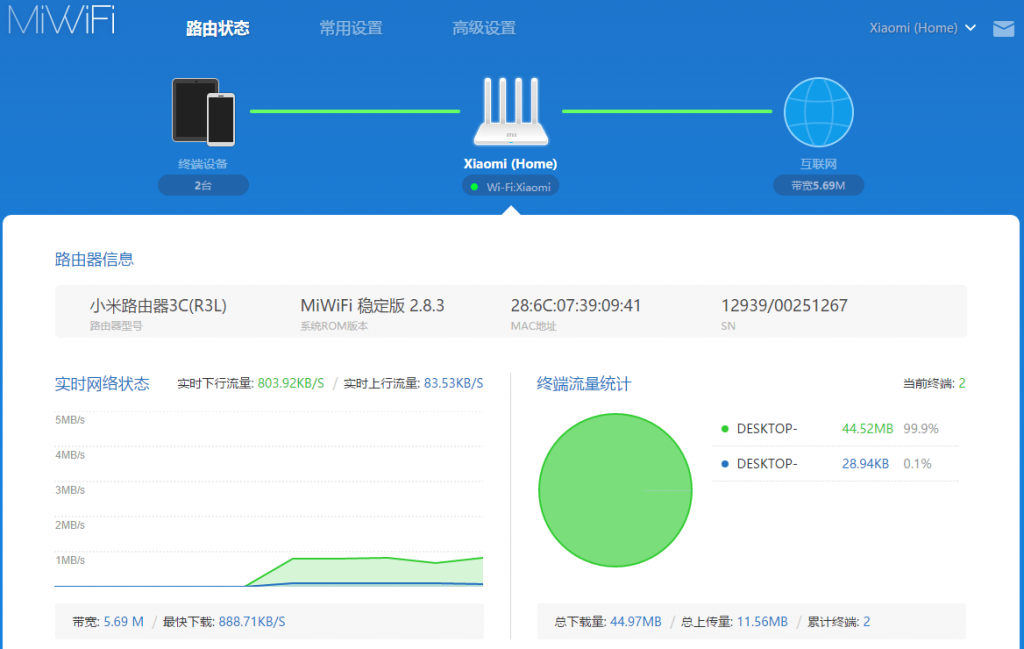 - в основном окне содержится информация о трафике, состоянии полосы канала в реальном времени, потреблении ресурсов ЦП и памяти роутера;