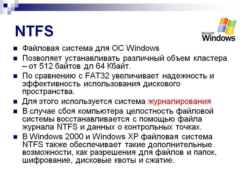 Естественно, это не полный перечень того, что предлагает современная файловая система NTFS.