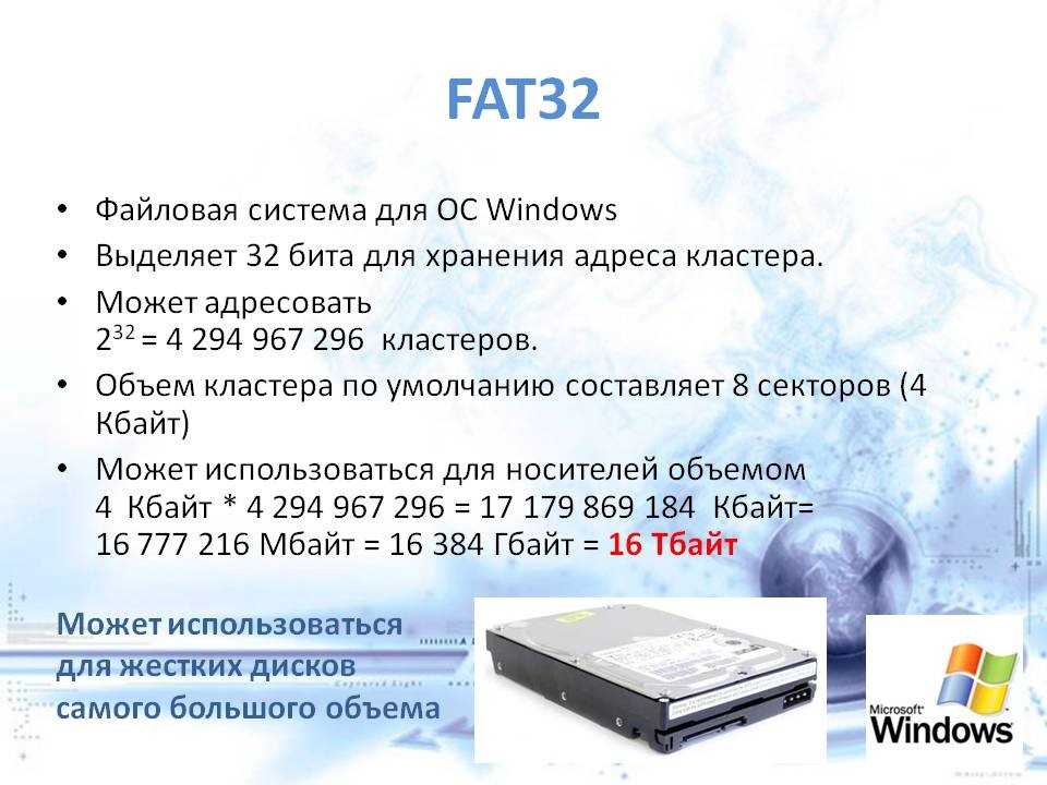 Имена файлов в FAT32 могут содержать до 255 символов. Максимально возможный размер одного файла составляет 4 Гб.