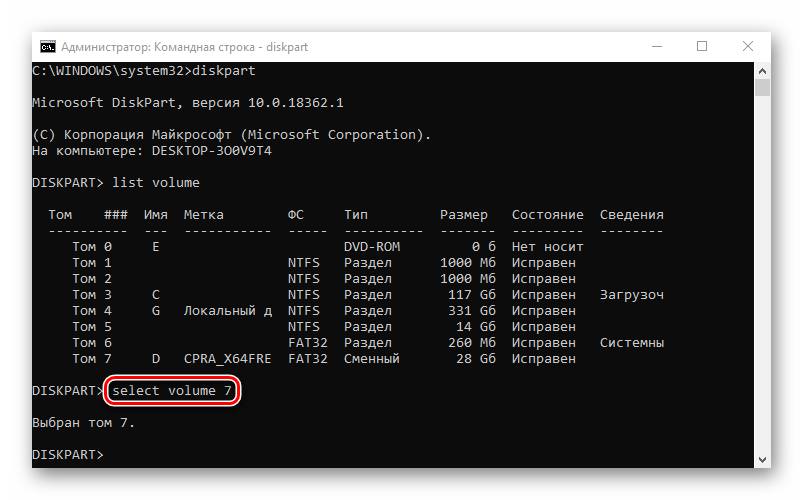 Вписываем и в списке томов ищем тот, который собираемся форматировать. В данном случае таким является том №7.