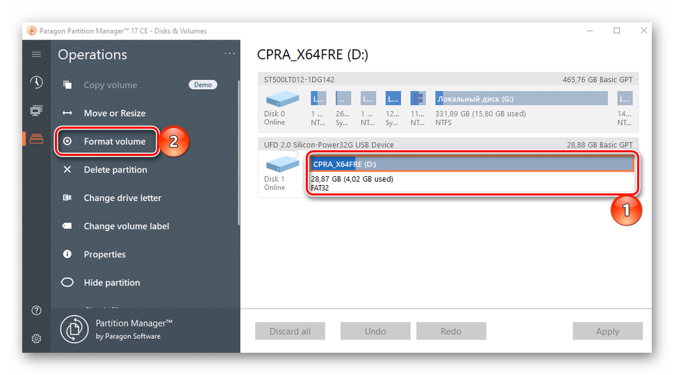 Щелкаем по области, отображающей свободное и занятое пространство USB-устройства, и нажимаем «Format volume».