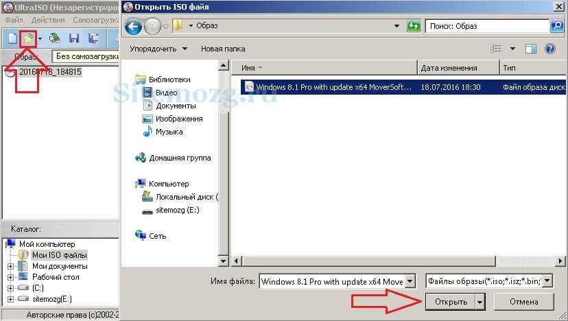 Запустится демо-версия UltraISO. Кликните на значок папки на панели инструментов программы. Найдите на компьютере файл ISO, нажмите Открыть