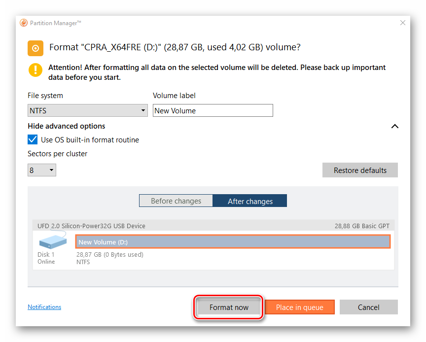 В области расширенных настроек можно изменить размер кластера, либо оставить значение, заданное по умолчанию.