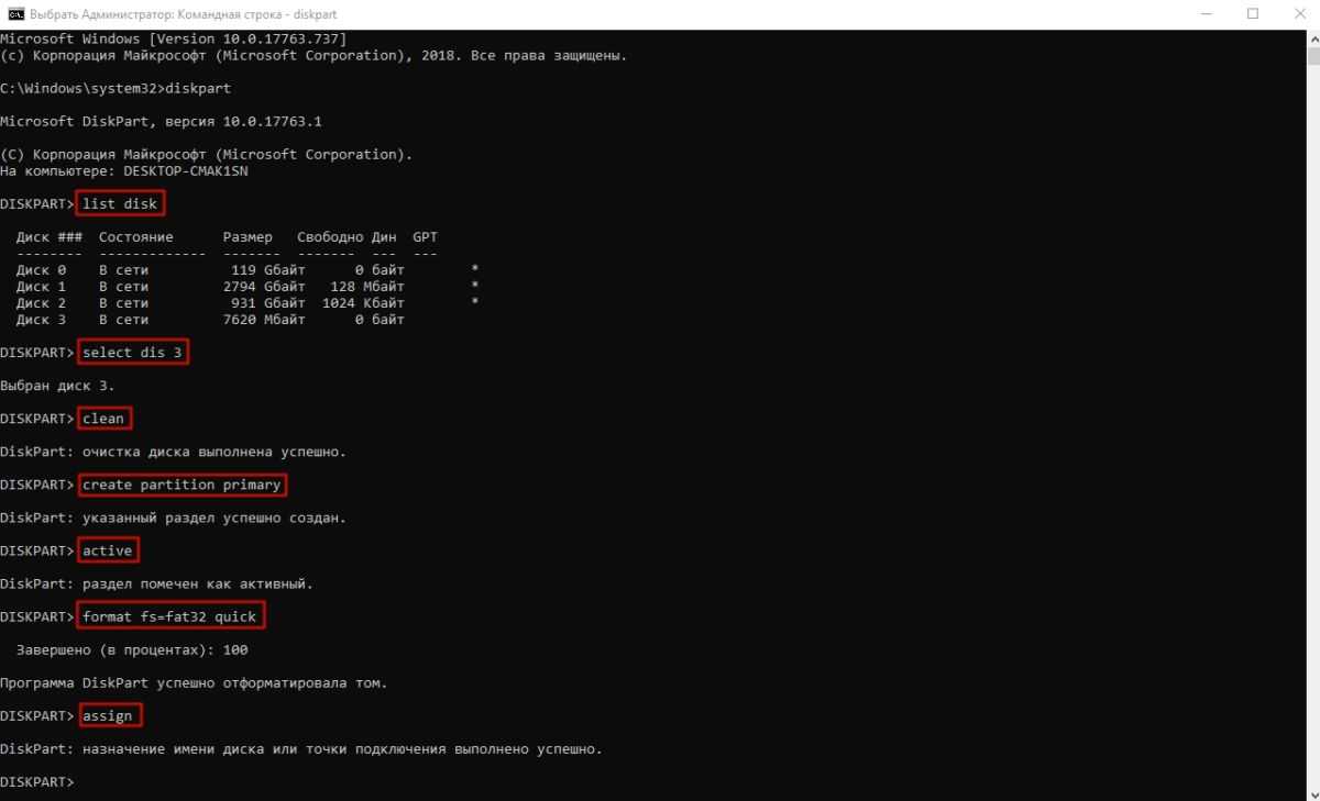 Далее командой «clean» Вы очищаете носитель, процедура может занять до нескольких минут. Затем создаёте раздел, активируете его. Сразу после происходит форматирование созданного раздела в формат NTFS (в какие-то моменты шкала процентов может останавливаться, беспокоиться не стоит). Следующей командой Вы назначаете имя диска. Последней – «Exit» — закрываете режим подготовки загрузочной флешки;