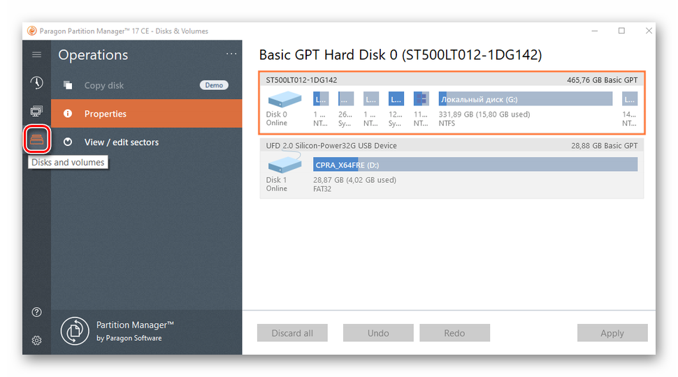 - Запускаем программу и выбираем раздел «Disks & Volumes».