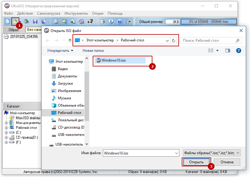 Для того чтобы сделать загрузочную флешку через UltraISO нам нужно открыть образ диска. Если вы нажали на кнопку «Да» после завершения создания ISO образа, то у вас уже открыт образ диска. Если нет, то вы можете открыть нужный вам образ диска с помощью кнопки «Открыть».