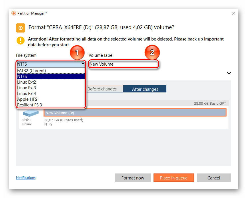 В графе «File system» выбираем файловую систему, в поле «Volume label» назначаем флешке имя.