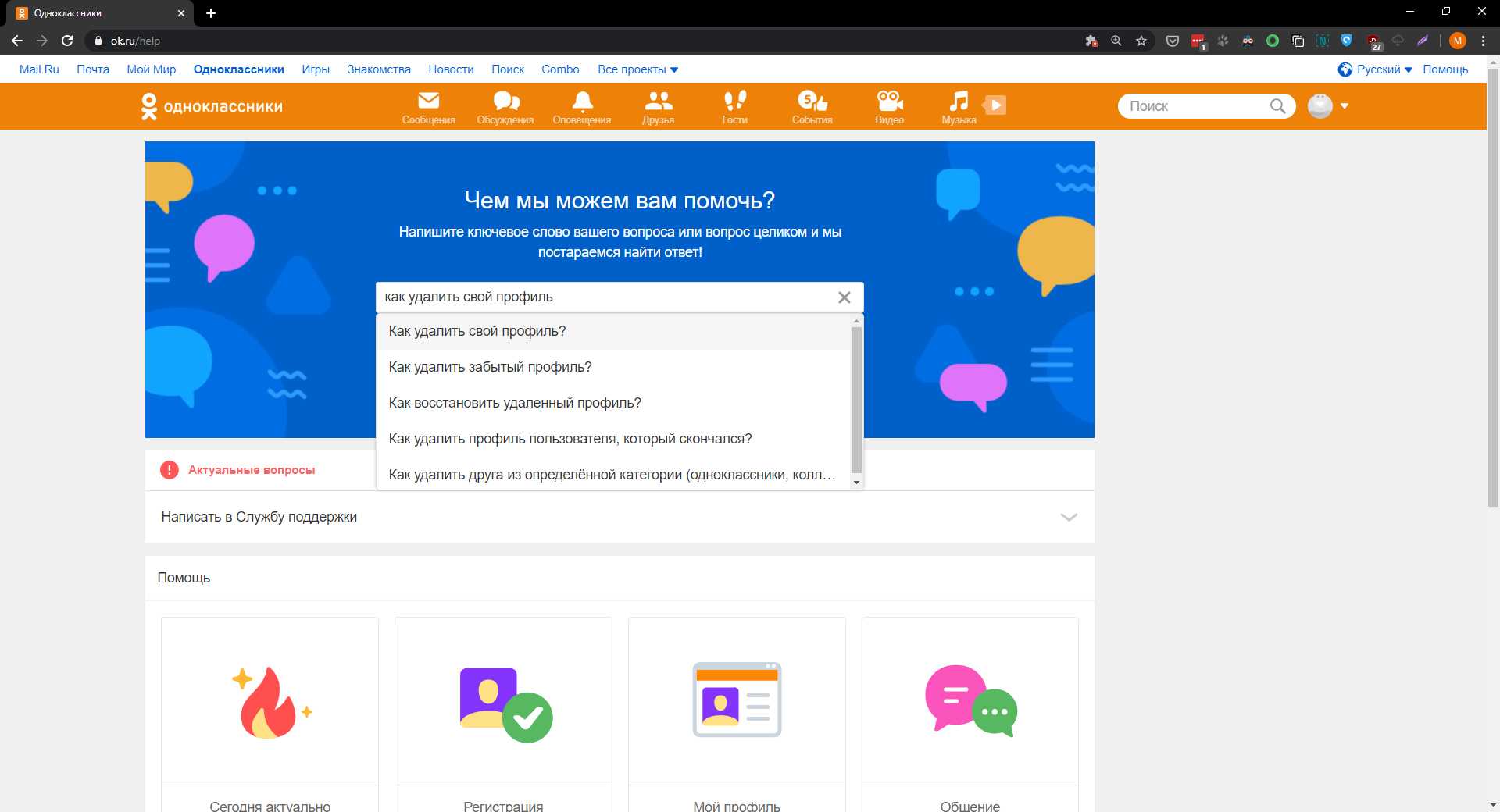 3. Через поиск найдите раздел «Как удалить свой профиль?».