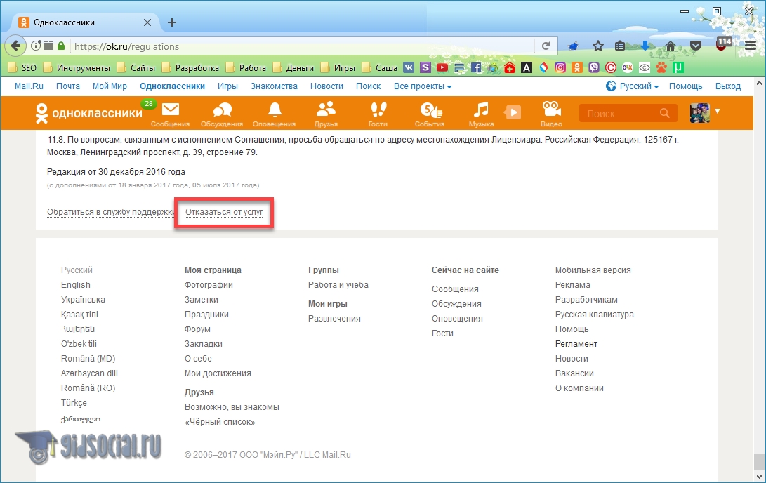 Рис. 2 (Кликните для увеличения). Для удаления личной странички в Лицензионном соглашении есть ссылка «Отказаться от услуг».Рис. 3. Заполняем форму Одноклассников, чтобы удалить свой профиль.