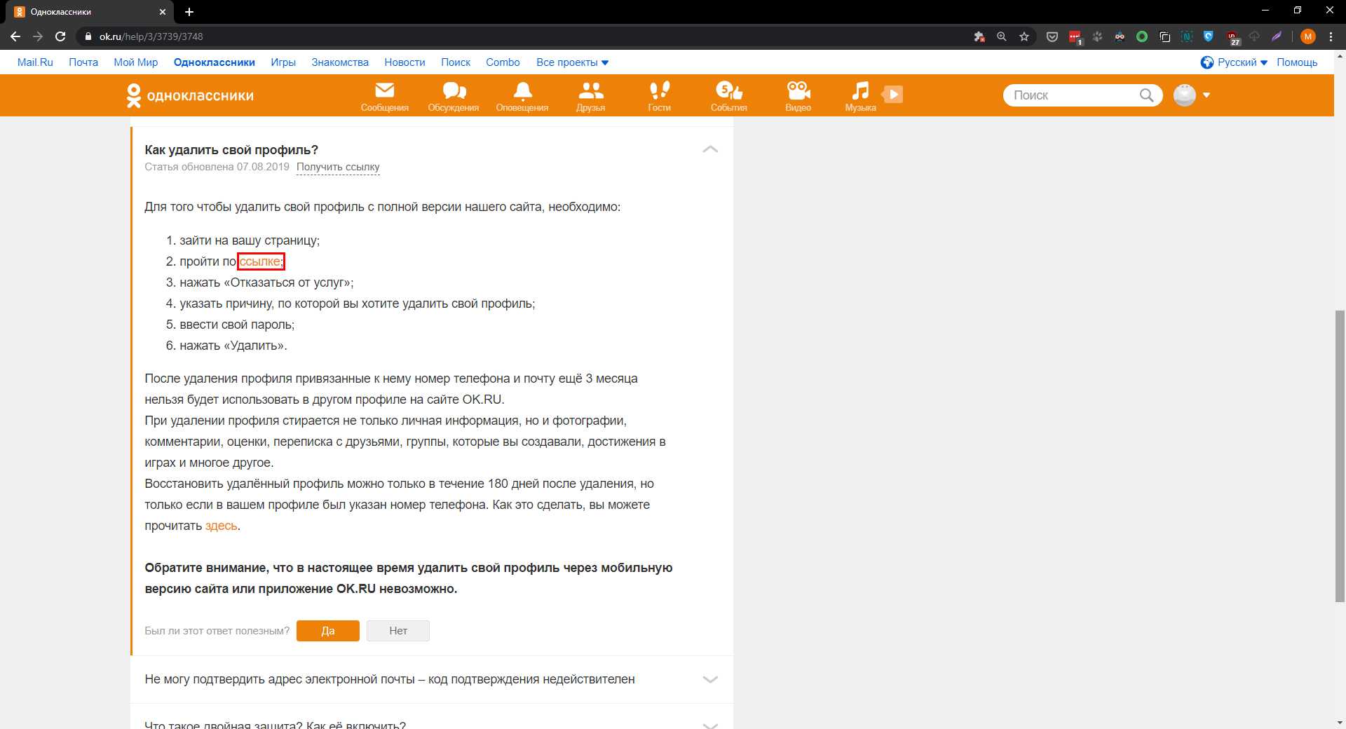 Официальная инструкция на сайте «Одноклассники» рекомендует удалять профиль на ПК. Поэтому теоретически разработчики могут отключить эту функцию на планшетах и смартфонах. Если у вас не получится попасть в меню удаления с мобильного устройства, попробуйте сделать это на компьютере.