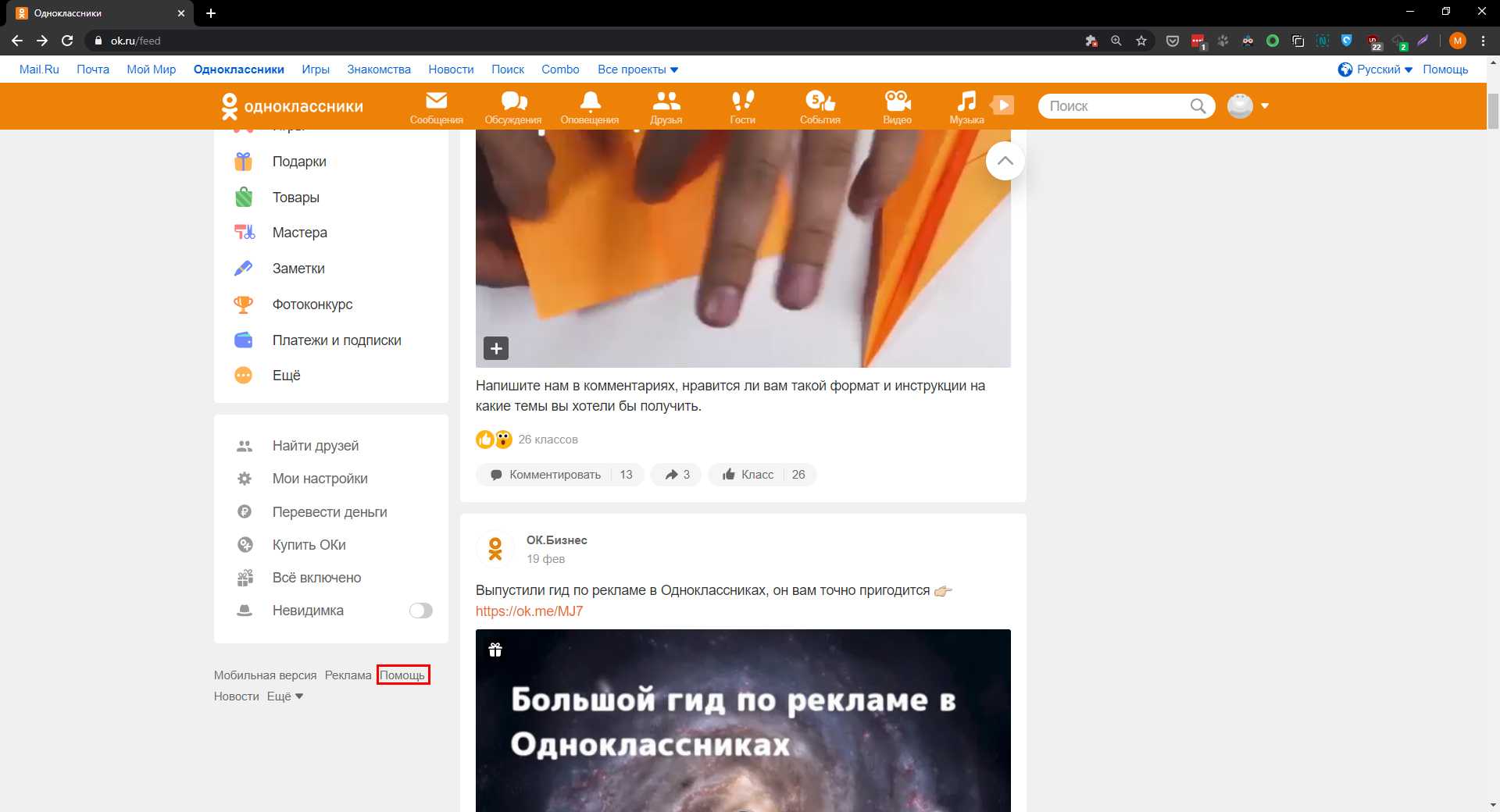 1. Откройте главную Ok.ru, в правом верхнем углу найдите раздел «Помощь».