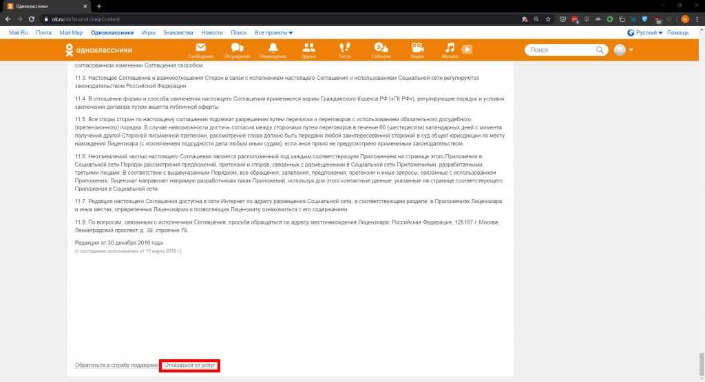 - На новой страничке представлены правила и условия использования социальной сети Одноклассники. Но наша задача не изучать их, а, наоборот, отказаться. Для этого прокручиваем текст вниз и кликаем по обозначенному на скриншоте пункту.