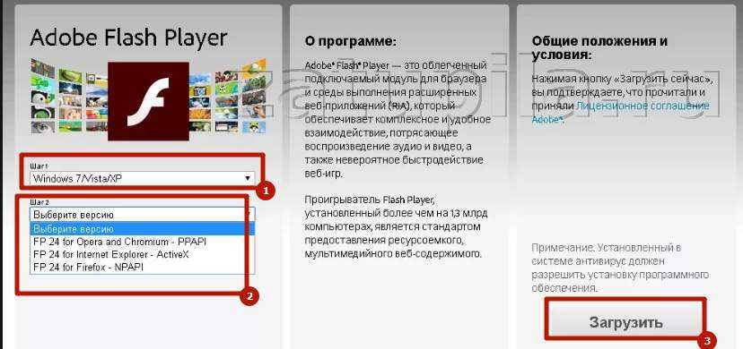 Скачать новую версию Flash Player можно на официальном сайте разработчиков, собственноручно набрав в поисковой строке браузера соответствующий запрос или нажав по приложенной к уведомлению ссылке. Как только откроется окно установки, смело жмите «Установить сейчас» и следуйте пошаговой инструкции, после чего выберите «Загрузить».