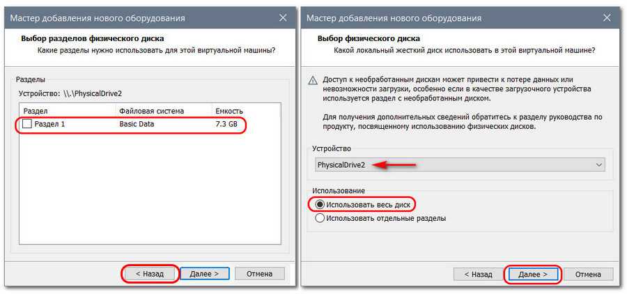 И по наличию разделов и ёмкости носителя, определяем, тот ли это, что нам нужен. Определяем и кнопкой «Назад» возвращаемся на этап выбора диска. В итоге указываем нужный диск типа PhysicalDrive№ и в графе «Использование» ставим уже пункт «Использовать весь диск».