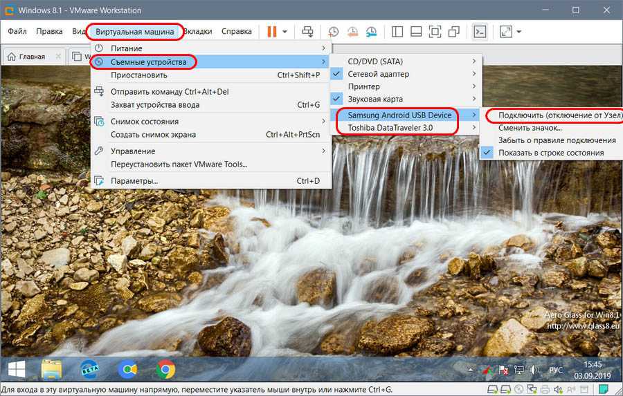 Подключать USB-носитель необходимо при работающей машине. Если это флешка или USB-HDD, внизу окна VMware Workstation, на панели состояния жмём значок носителя данных и жмём «Connect (Disconnect from Host)».