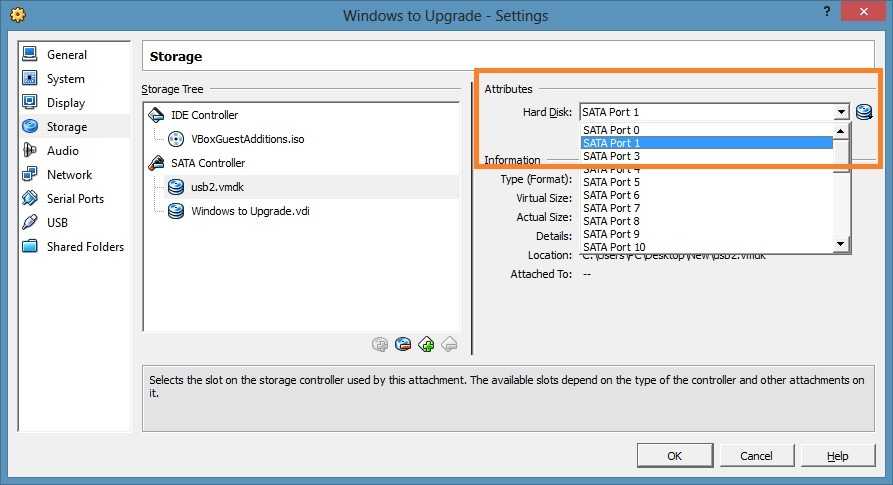На вкладке «Носители» добавляем созданный usb.vmdk в качестве виртуального диска. Добавлять можно как к IDE, так и к SATA контроллеру, особой разницы нет.