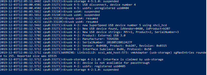 2019-12-03T12:06:12.546Z cpu0:33271)usb 4-2: new SuperSpeed USB device number 5 using xhci_hcd 2019-12-03T12:06:12.570Z cpu0:33271)usb 4-2: New USB device found, idVendor=0480, idProduct=b207 2019-12-03T12:06:12.570Z cpu0:33271)usb 4-2: New USB device strings: Mfr=1, Product=2, SerialNumber=3 2019-12-03T12:06:12.570Z cpu0:33271)usb 4-2: Product: External USB 3.0 2019-12-03T12:06:12.570Z cpu0:33271)usb 4-2: Manufacturer: TOSHIBA 2019-12-03T12:06:12.570Z cpu0:33271)usb 4-2: SerialNumber: 20180528012427F 2019-12-03T12:06:12.571Z cpu0:33271)usb 4-2: Vendor: 0x0480, Product: 0xb207, Revision: 0x0315 2019-12-03T12:06:12.571Z cpu0:33271)usb 4-2: Interface Subclass: 0x06, Protocol: 0x50 2019-12-03T12:06:12.571Z cpu0:33271)WARNING: LinScsiLLD: scsi_add_host:573: vmkAdapter (usb-storage) sgMaxEntries rounded to 255. Reported size was 65535 2019-12-03T12:06:12.571Z cpu0:33271)usb-storage 4-2:1.0: interface is claimed by usb-storage 2019-12-03T12:06:12.571Z cpu0:33271)usb 4-2: device is not available for passthrough 2019-12-03T12:06:12.571Z cpu0:33271)usb 4-2: usbfs: registered usb0405 2019-12-03T12:06:15.454Z cpu0:33207)usb-storage 4-2:1.0: suspended