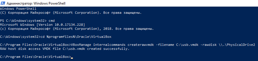 - Теперь надо набрать и выполнить следующую команду: «VBoxManage internalcommands createrawvmdk -filename C:\USB.vmdk -rawdisk \\.\PhysicalDrive1».