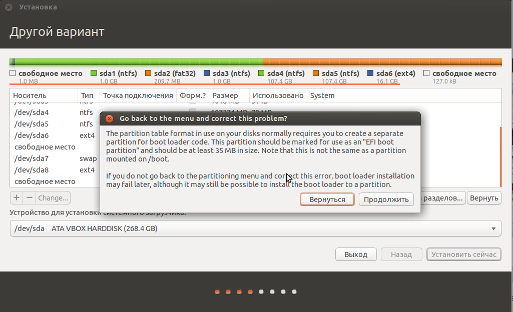 Исправьте ошибку, а если не получится, выйдите из установщика, запустите редактор GParted и проверьте, что всё, рассказанное выше, выполнено.
