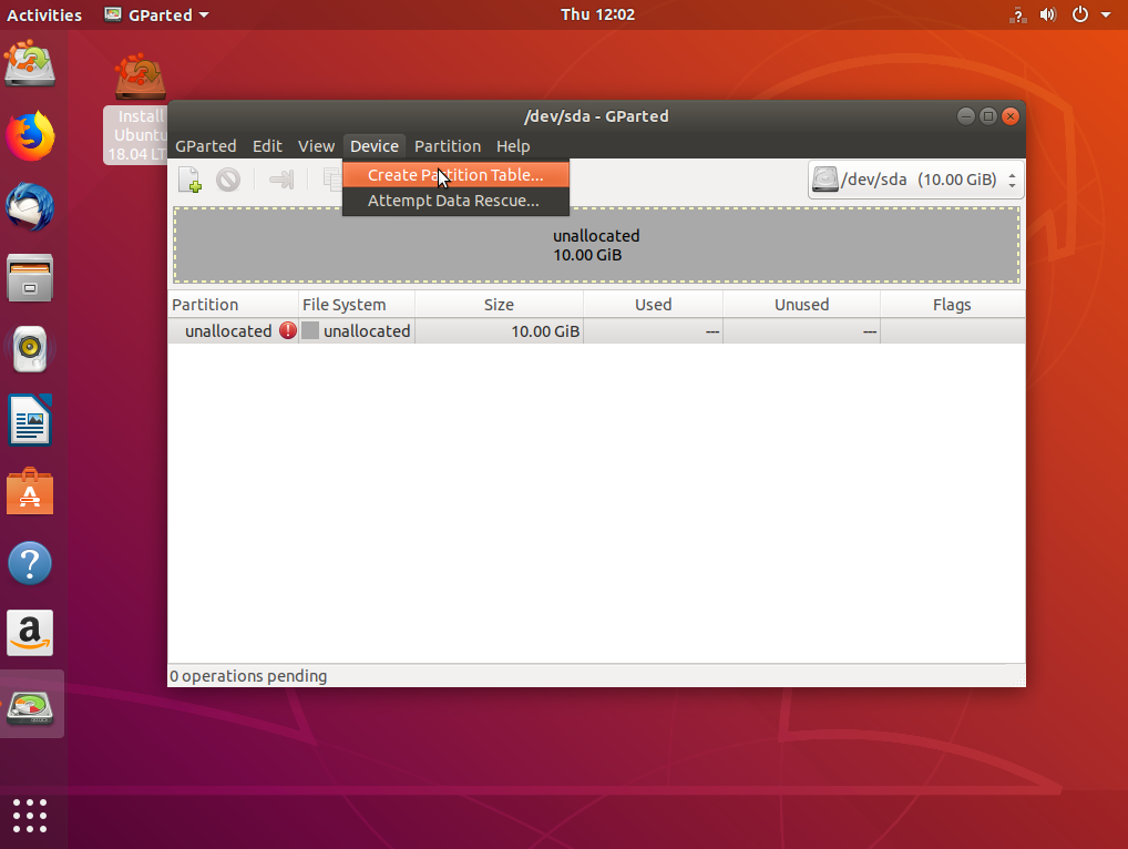 Перед тем, как нажать «Install Ubuntu» желательно подготовить диск с помощью Gparted. Откройте утилиту из главного меню образа. Затем выберите Device -> Create Partition Table: