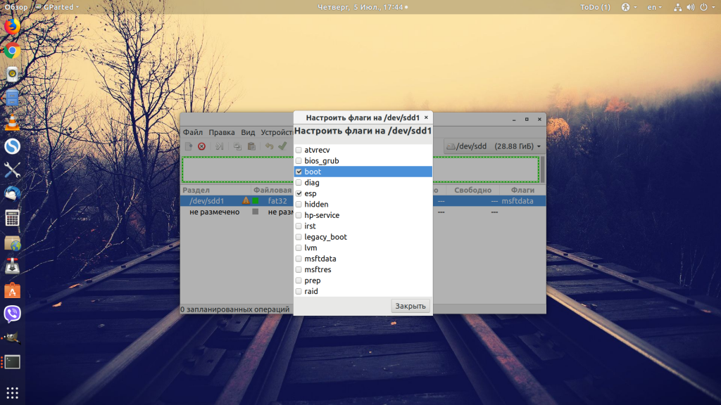 Здесь /dev/sdb1 — имя раздела вашей флешки. Вы можете выполнить все эти действия в файловой менеджере. Не обязательно использовать команды. Далее нужно установить на раздел флешки, куда вы распаковали свои файлы два флага — boot и lba. Это можно сделать с помощью Gparted. Просто запустите программу, выберите в списке дисков свою флешку: