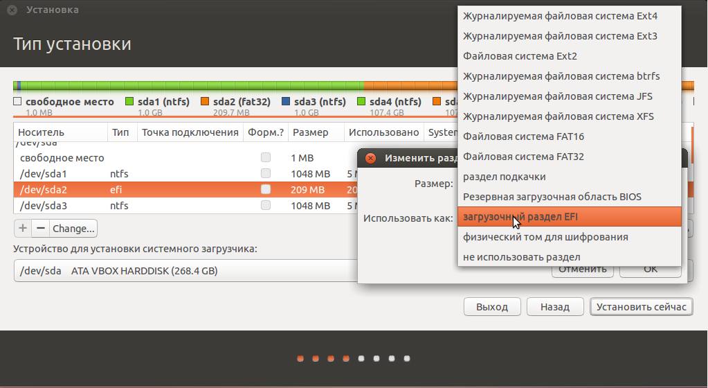 Просто достаньте бумажку с перечнем разделов и обратите внимание, что для специального раздела EFI (/dev/sda2 из примера о совместной установки Ubuntu и Windows) нужно точно назначить свойство загрузочного раздела EFI, а не резервной загрузочной области BIOS: