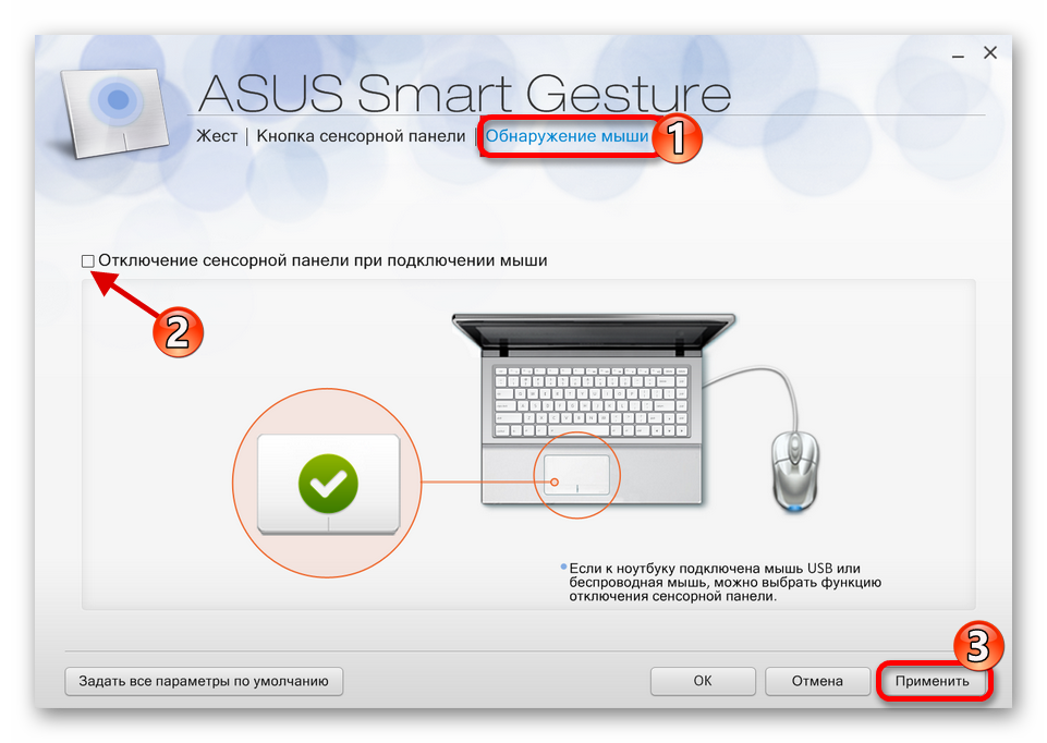 - В случае, когда пользователь иногда использует внешнюю мышку, то будет удобно воспользоваться графой «Отключение при подсоединении внешней USB-мыши»;