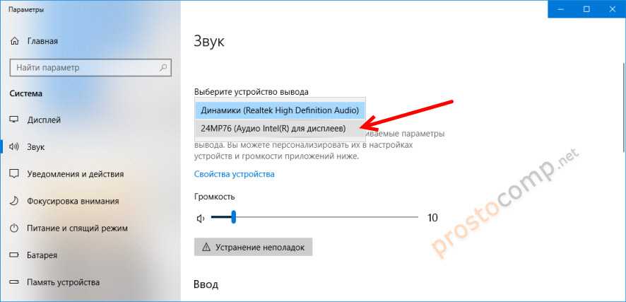В Windows 10 менять устройство вывода звука можно прямо в параметрах. Просто выберите телевизор в меню «Выберите устройство вывода» (если он там есть). В моем случае это модель монитора (у меня монитор с динамиками) и «Аудио Intel для дисплеев». В зависимости от установленной в компьютере видеокарты и подключенного ТВ, у вас устройство может отличаться.
