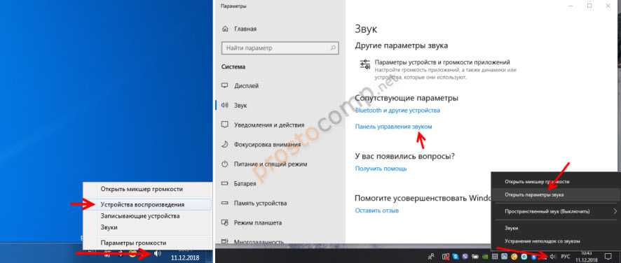 В Windows 10, Windows 8 и Windows 7 все эти настройки выглядят примерно одинаково. В Windows 10 немного запрятали панель управления звуком. Но ничего, найдем!