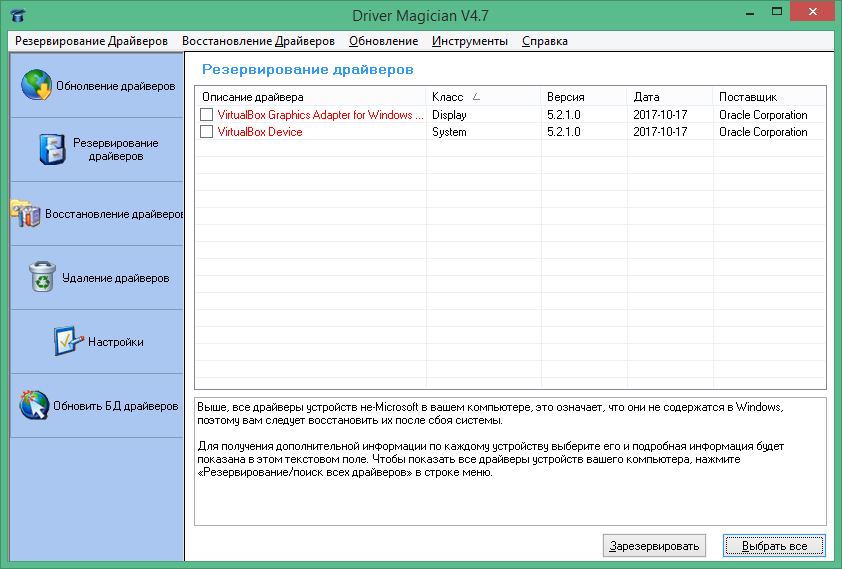В управлении утилитой нет ничего сложного: резервирование, восстановление, удаление и загрузка новых драйверов. Также пользователь в любой момент может просмотреть конфигурации аппаратной части компьютера.