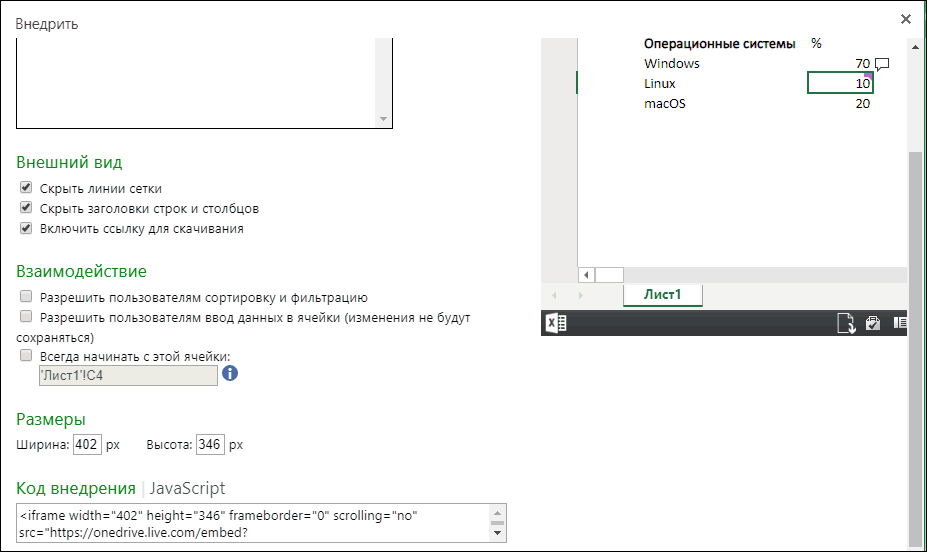 Ещё один способ поделиться таблицей, созданной в Excel Online, — вставить её на сайт с помощью HTML-кода. Чтобы воспользоваться этой возможностью, пройдите по пути «Файл» — «Поделиться» — «Внедрить». Затем нажмите на кнопку «Создать». В окне предварительного просмотра, которое откроется после этого, можно выбрать, что из таблицы должно отображаться на сайте после вставки кода на страницу.