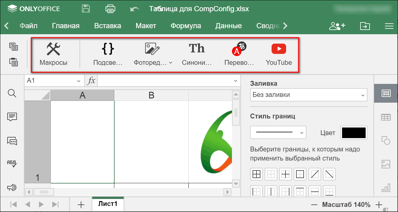 Конкурентное преимущество OnlyOffice перед Excel Online — поддержка макросов для автоматизации пользовательских действий. Создавать новые алгоритмы можно на вкладке «Плагины». Здесь же собраны инструменты для подсветки кода, редактирования изображений, подбора синонимов, перевода текста и вставки видео с YouTube.