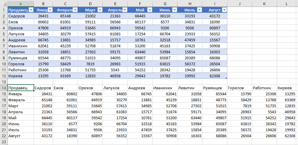 Готово! Месяцы теперь размещены по строкам, а фамилии продавцов по колонкам. Все что остается сделать – это преобразовать полученные данные в таблицу.