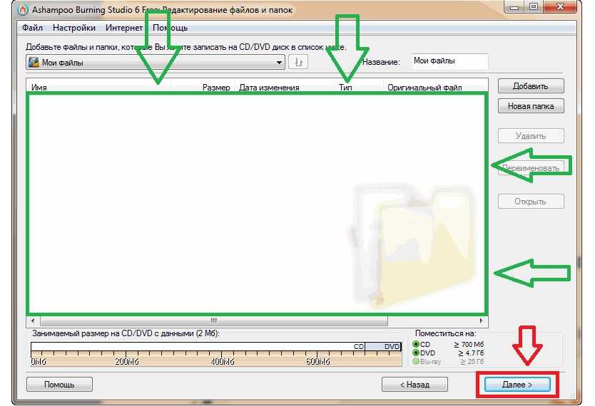Далее появляется окно, очень похожее на то, что мы уже видели в Small CD-Writer. Здесь тоже нужно просто перенести нужные файлы в область, обведенную зеленой рамкой на рисунке №4. Когда они будут добавлены, осталось нажать на кнопку «Далее», расположенную в нижнем правом углу окна программы (обведена красной рамкой).