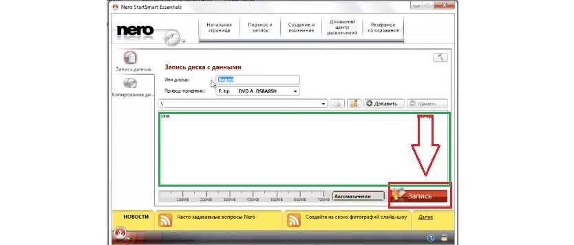 Итак, сам процесс записи файлов на диск, ДВД или СД, заключается в том, чтобы просто перетащить мышкой нужные файлы из какой-то папки в пространство, обведенное на рисунке №1 зеленой рамкой.