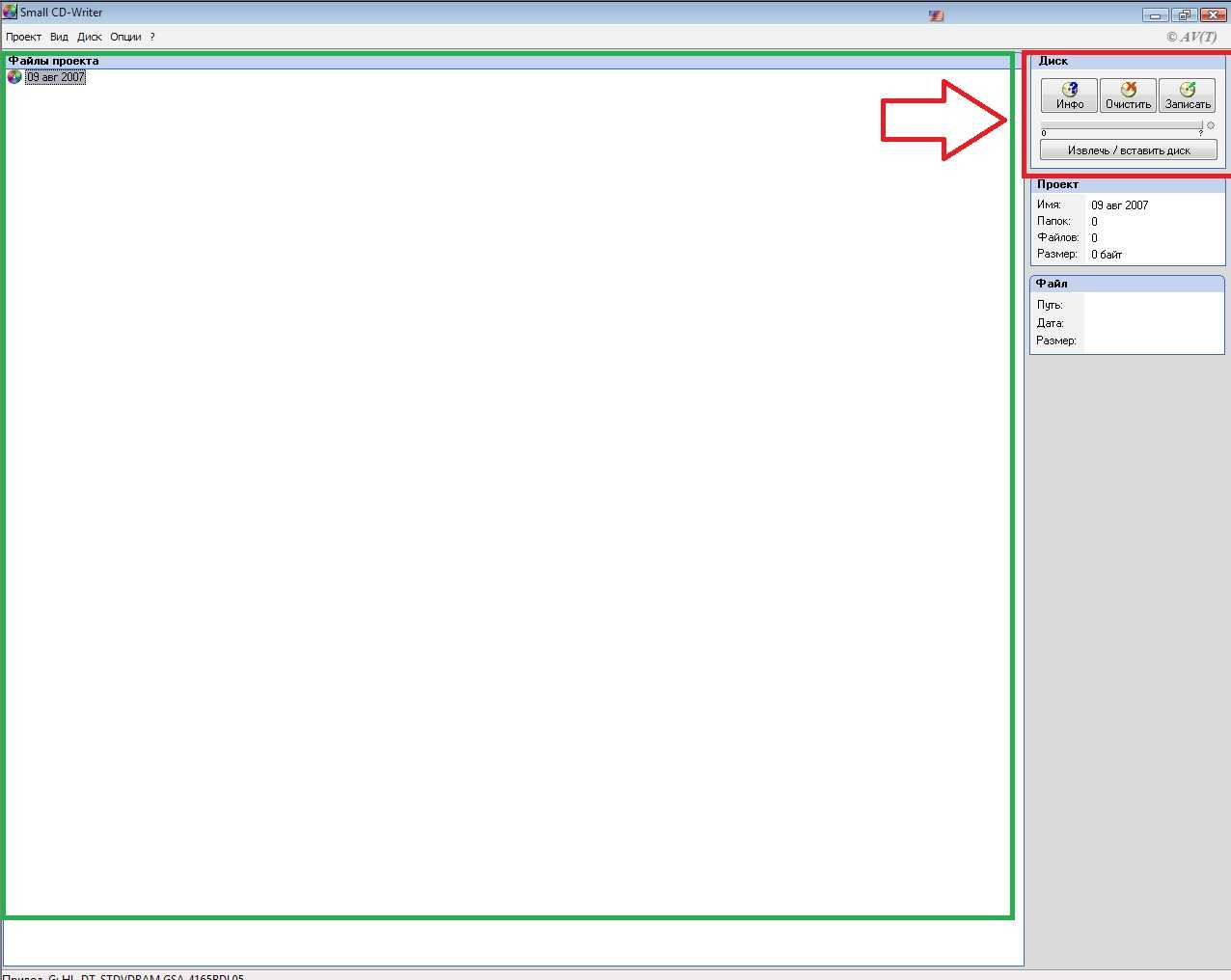 Есть поле, куда нужно вставлять все файлы, предназначенные для записи на диск (на рисунке №7 оно тоже выделено зеленым цветом).