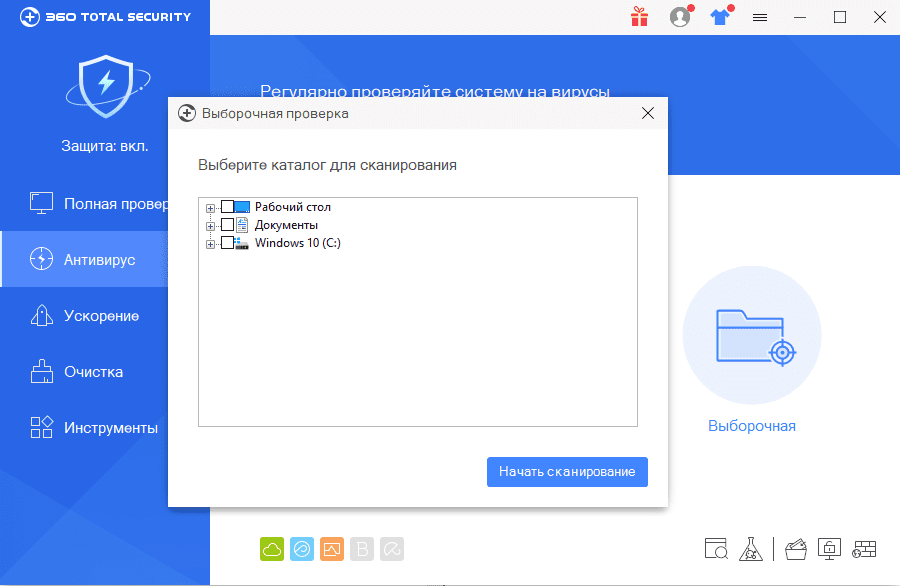 Выбрав данный режим, можно указать приложению, где конкретно нужно проводить сканирование на вирусы. Это позволяет использовать утилиту эффективнее и не загружать весь жёсткий диск или твердотельный накопитель.
