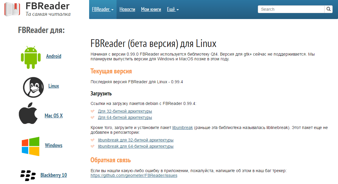 Кроме того, для Mac OS есть версия программы FBReader. Установить её можно и на Linux – соответствующая версия также располагается на сайте программы.