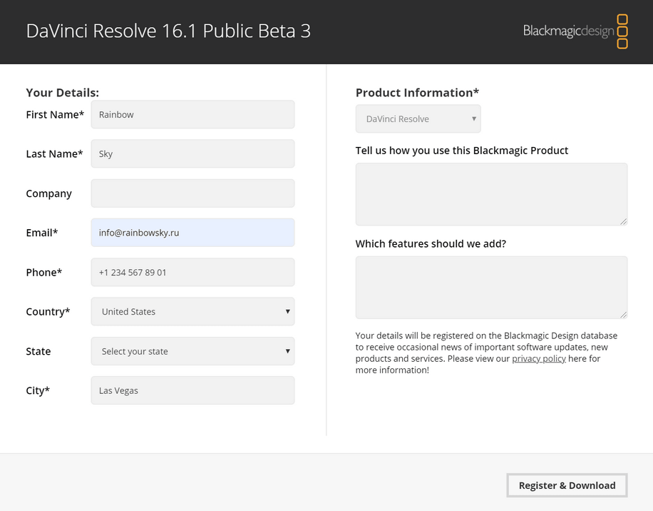 Для загрузки программы необходимо заполнить простую анкету, введя в обязательные поля поля отмеченными звездочками свои имя и фамилию, адрес электронной почты, телефон, страну и город проживания. Сразу после нажатия кнопки «Register & Download» начнется скачивание.