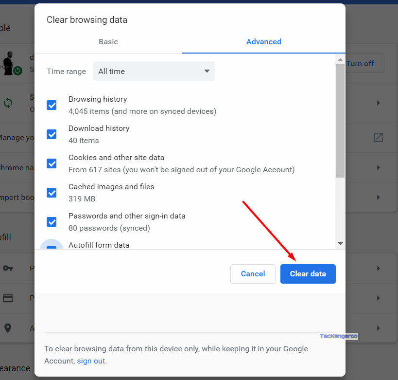 Check the following options: Browsing History, Download History, Cookies and other site and plugin data, Cached Image and files, Autofill form data and Passwords.