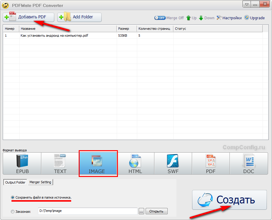 Далее добавляем нужный файл, выбираем формат, в который хотим преобразовать PDF (в нашем случае «Image»), указываем, куда сохранять результаты и нажимаем кнопку «Создать».